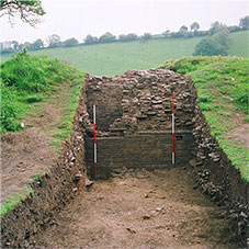 Wigmore Castle 1996. Early days in the excavation showing the exposed curtain wall looking south (CP 6: 2816005. Marches Archaeology)